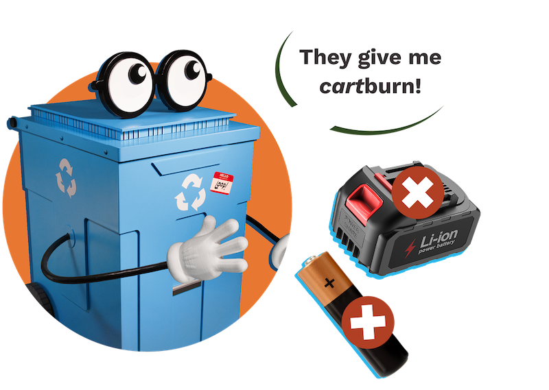 Batteries cause fires and MUST be taken to special collection sites. Use Recycle Coach to find current information on preparing your batteries for drop-off and to find a location near you.